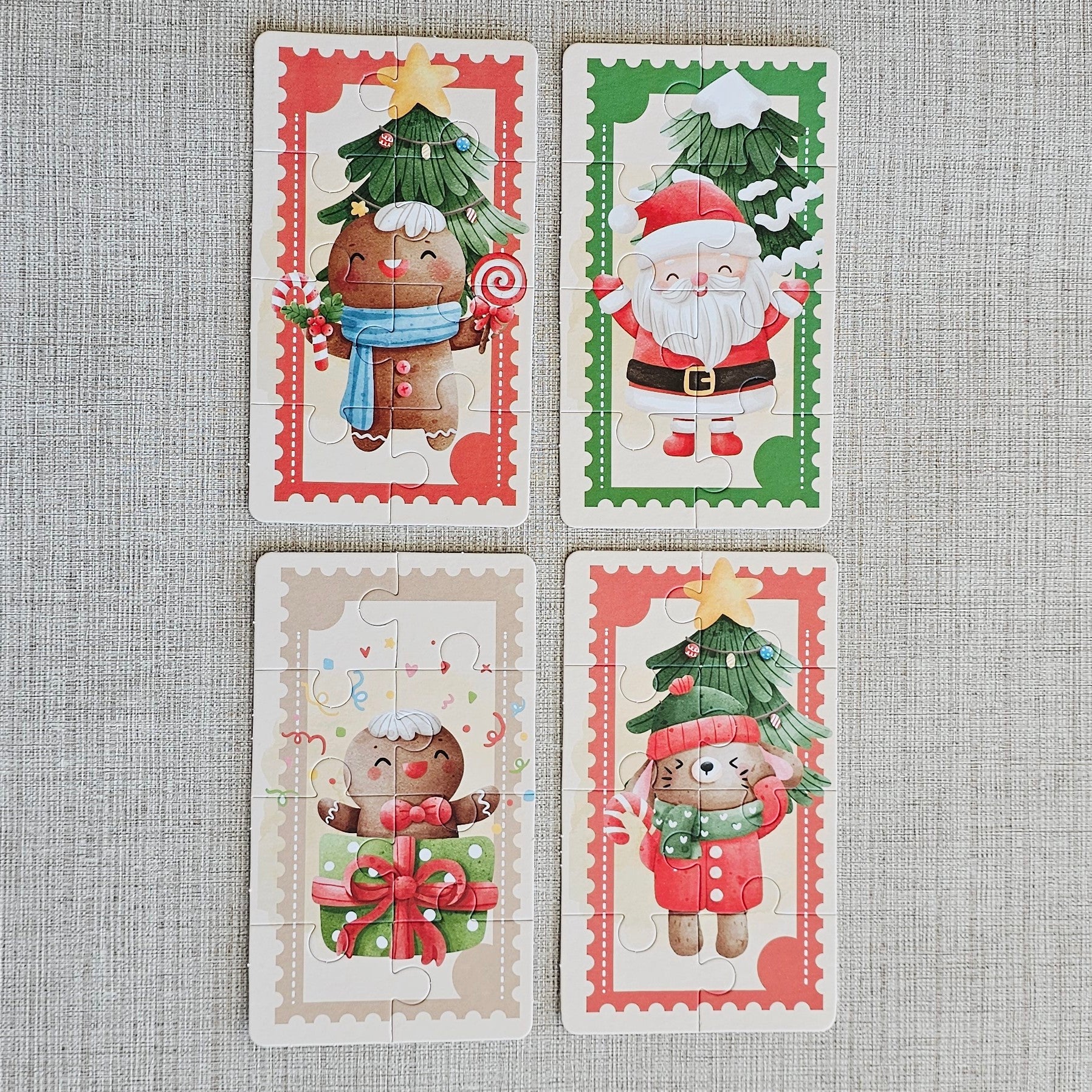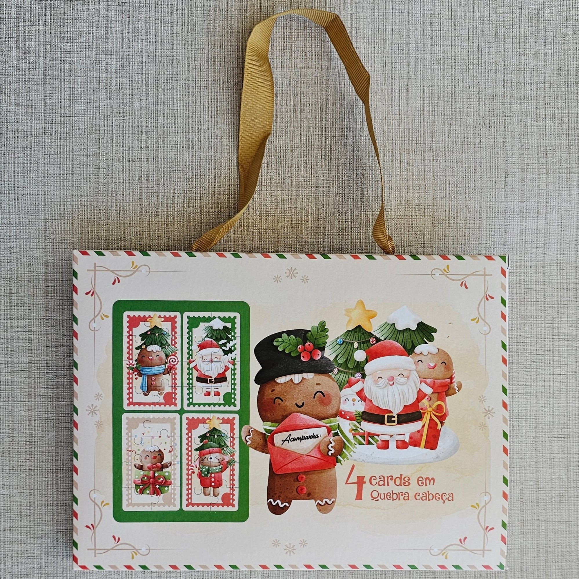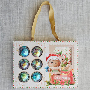 Caixa de papelão com desenhos natalinos contendo 6 bombons de chocolate ao leite e 4 quebra cabeças para montar.