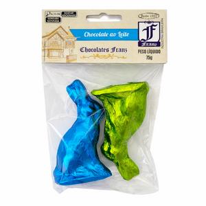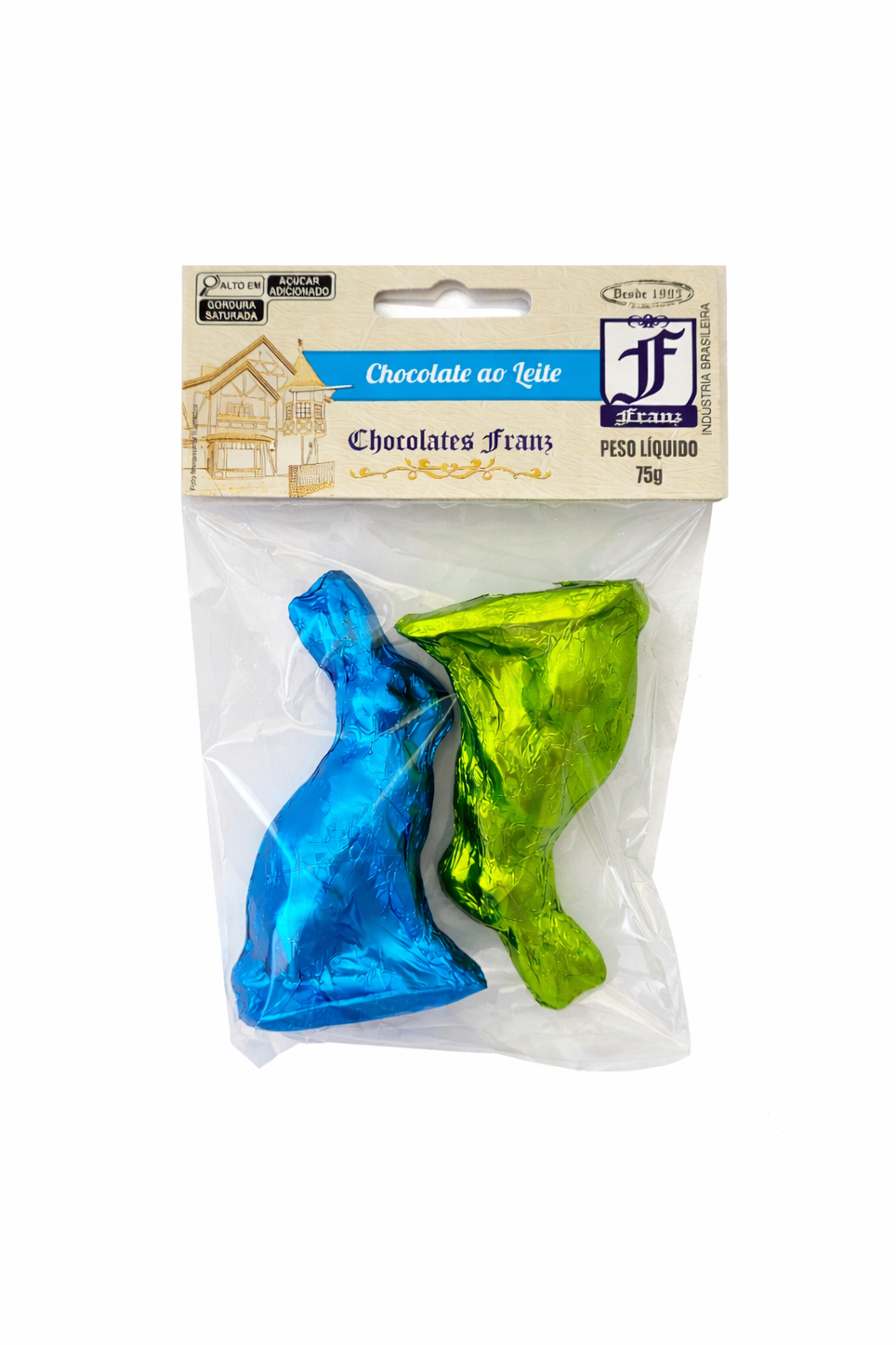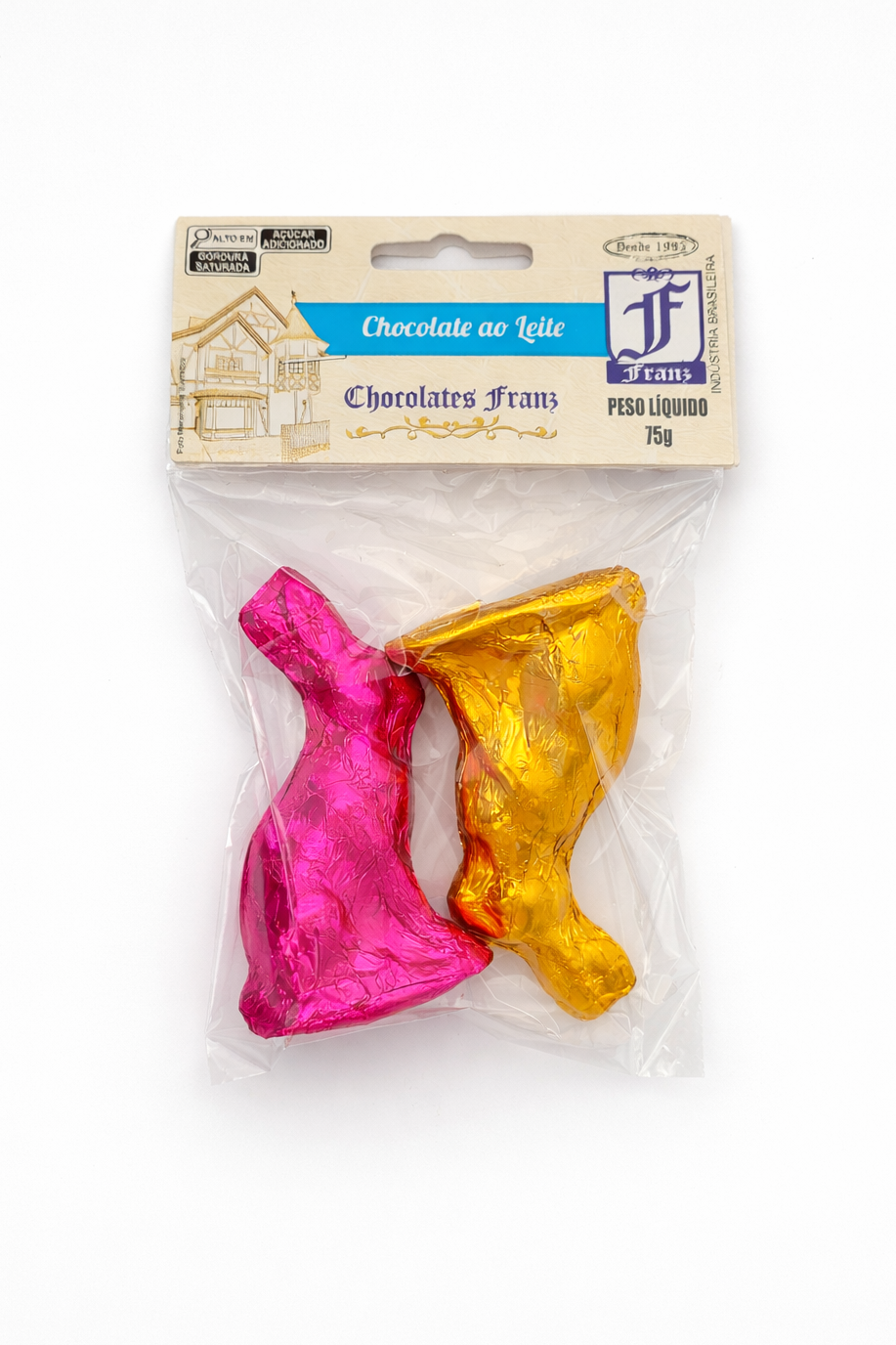 Dimensão do coelhinho de chocolate maciço no pacote com 2 de 38 g: 8 cm alt. x 4.5 cm larg. x 2 cm prof.