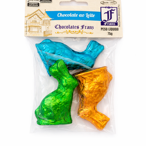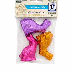 Dimensão do coelhinho de chocolate maciço no pacote com 3 de 25 g: 7 cm alt. x 3.5 cm larg. x 1.5 cm prof.